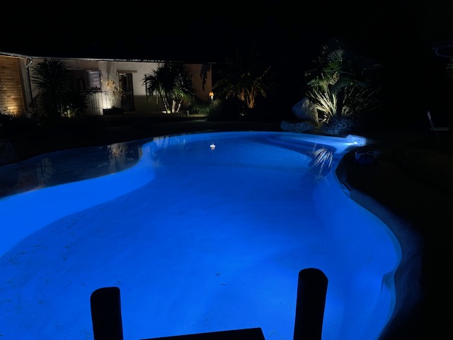 Le bassin a été enrichi d’une banquette balnéo à forme libre, équipée d’un blower, pour une détente totale, ainsi que d’une cascade en rochers, intégrée avec goût pour un rendu 100 % naturel. Des rochers d’ornement ont été répartis tout autour du bassin pour renforcer l’aspect lagon.